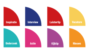 De thema’s hebben elk een GG secundaire kleur. De thema’s in witte tekst, font Barlow Condensed.